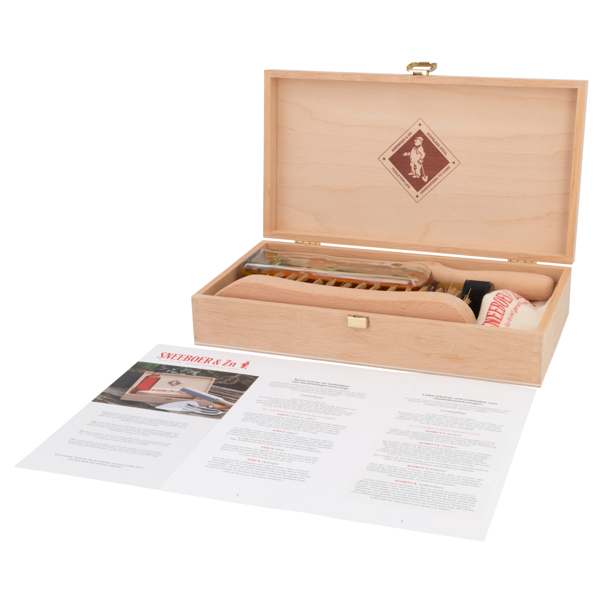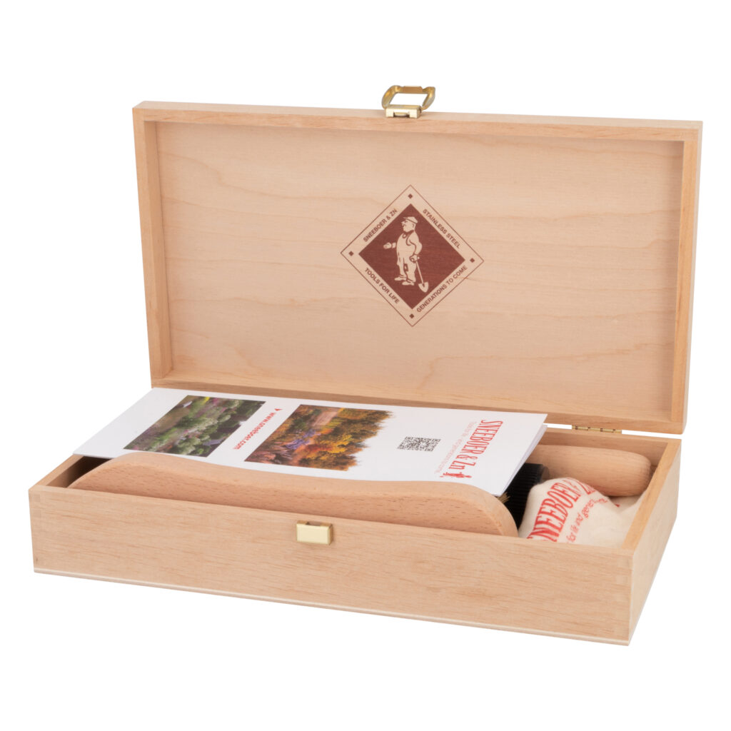 Dieses nachhaltige Pflegeset enthält alles, was Sie brauchen, um Ihre Gartengeräte von Sneeboer optimal instand zu halten. Die Box enthält einen Werkzeugschärfer, eine kupferbeschichtete Drahtbürste, eine Flasche mit gekochtem Leinöl sowie ein Tuch, mit dem das Öl aufgetragen werden kann. Alle diese Artikel werden in einer luxuriösen Holzkiste geliefert. Mit den Artikeln in dieser Box können Sie Ihre Gartengeräte fachgerecht pflegen.