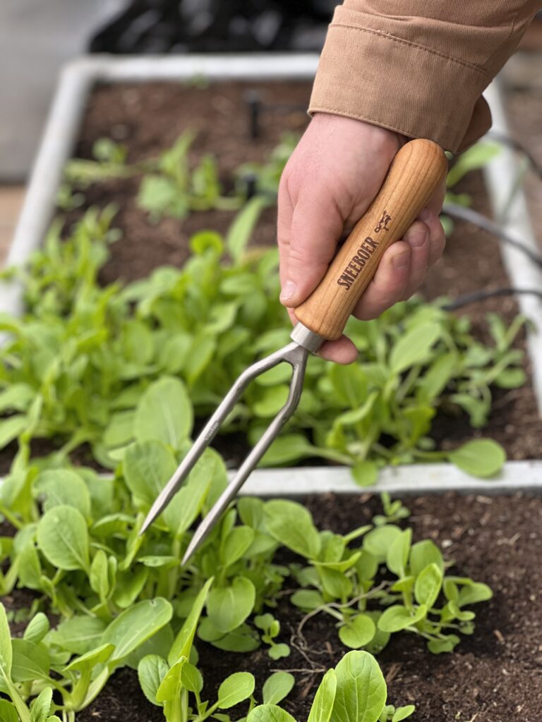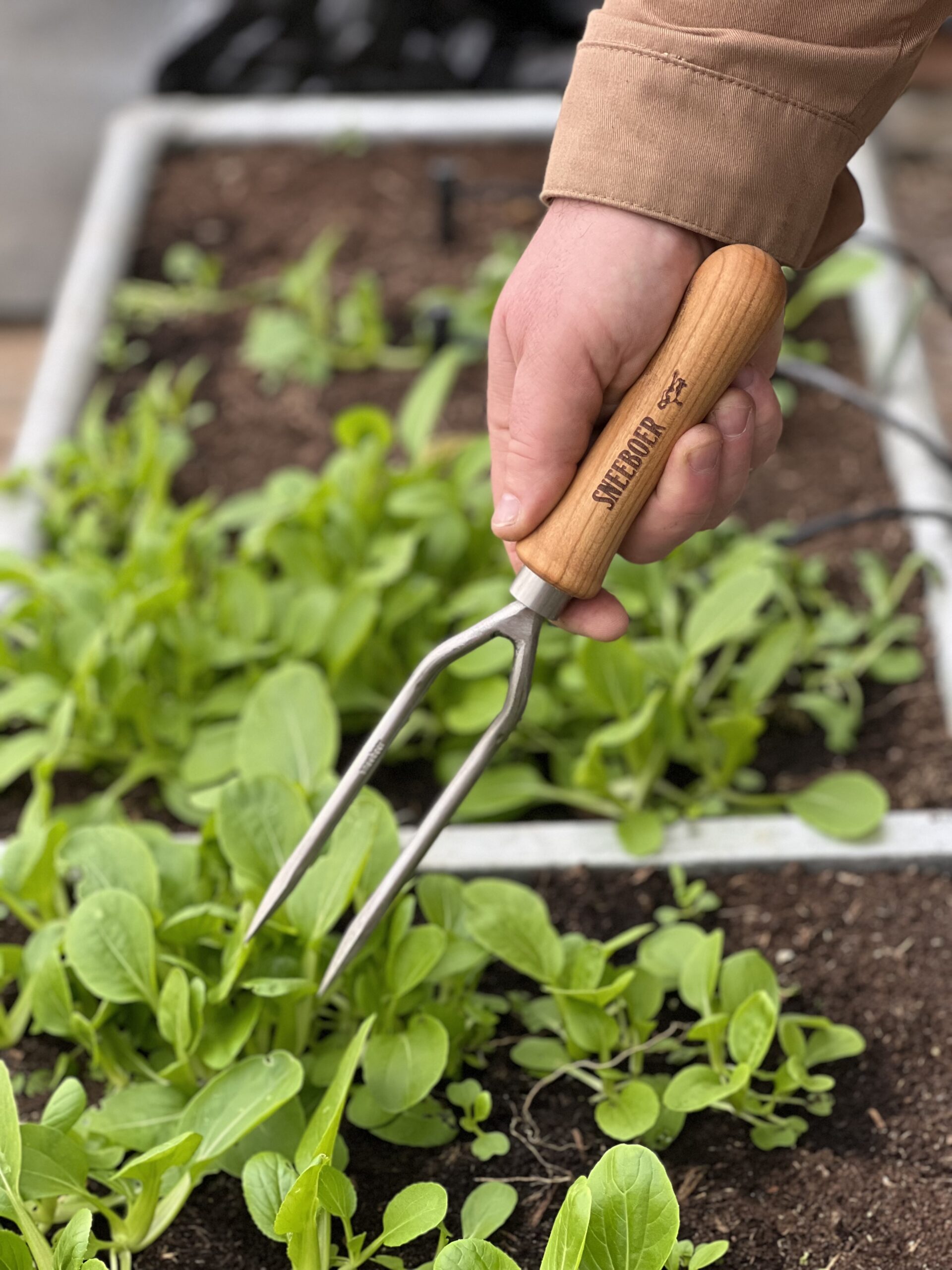 The famous 19th century English garden designer Gertrude Jekyll mentioned that the weeding fork was her favorite garden tool. The weeding fork is the tool to use when deeply rooted weeds need to be removed from crowded borders, but it can also be used to aerate the soil or mix compost and other fertilizers with the soil. The design of the weeding fork makes it very comfortable to use without straining the wrists. The weeding fork is primarily made for use close to ground, ensuring optimal view of the work and precision. The weeding fork is available with an ash or cherry handle or with longer ash handles for raised bed gardening.